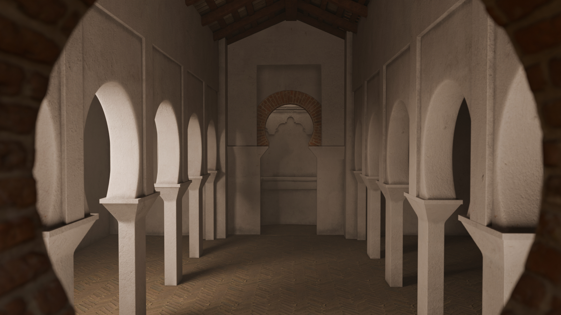 On the east side, an auxiliary door also allowed access to the interior of the building from the courtyard. At the back of the central nave was the mihrab, a niche located in the center of the qibla wall, which marks the canonical direction of prayer. This is the most important space in the mosque, since it is where the faithful must direct their gaze and next to it the imam is placed to lead the prayer. Although only the foundations of the mihrab have been documented, the data extracted from the excavations, as well as the information obtained from other rural mosques, have allowed a hypothetical reconstruction of its elevation and interior decoration to be carried out.